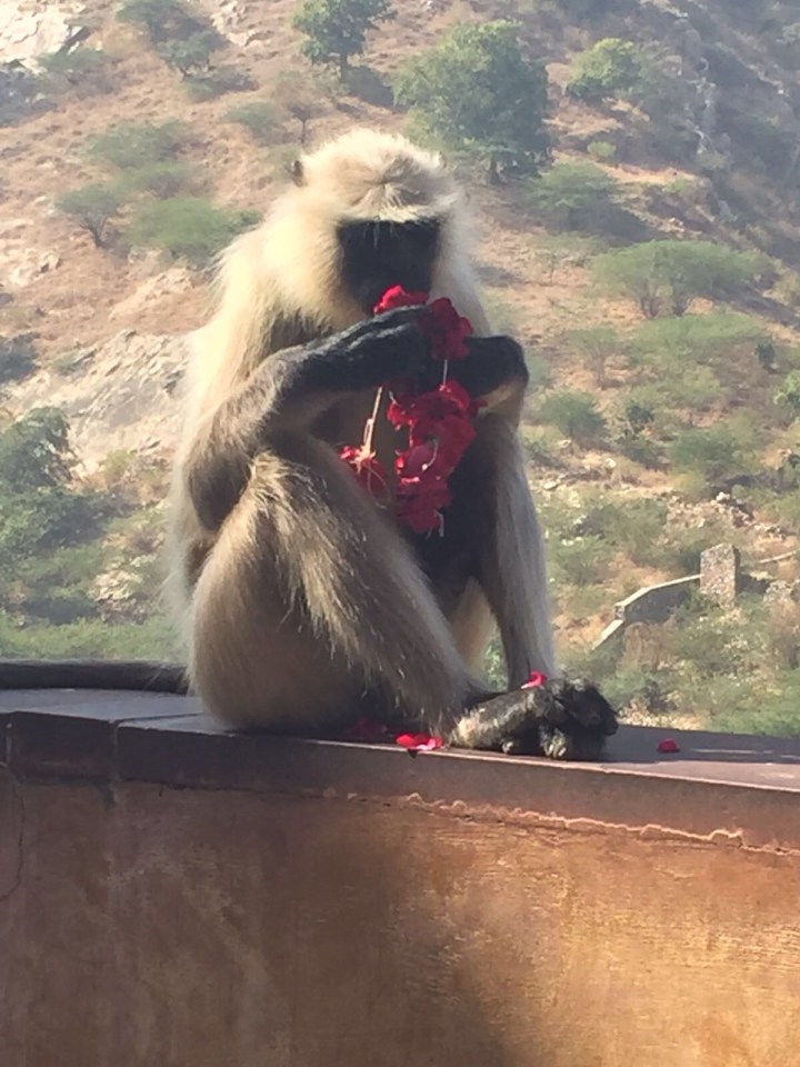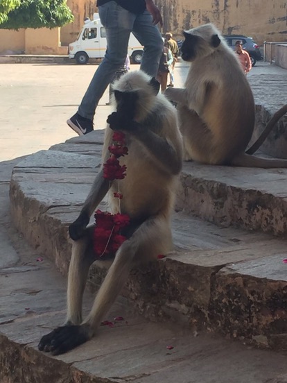 Our driver had bought us flower garlands and insisted we wore them into the Fort. We later learnt why. Graham said look there’s a monkey looking at you. This man said he wants your flower so I started to break off a flower when the monkey ran up to me and tugged the garland from around my neck and ran away to eat it. Another did it to graham. We did laugh as well as everyone around us.